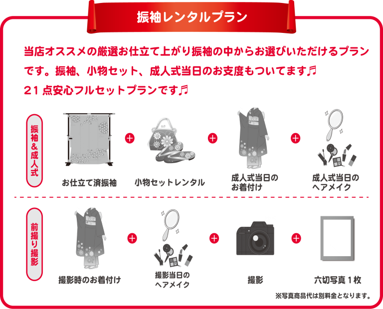 振袖・帯・小物セット・前撮りヘアメイク着付け・成人式当日ヘアメイク着付けが付いた